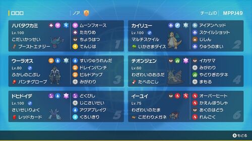 展開、サイクルの2軸 序盤適当に使ってた並びに入っていた電磁波カミ、舞スケショカイリュー、身代わりビルドラオスの展開選出が強力で、ほぼこの選出だけで序盤中盤ずっと1桁にいられたのでこれを軸とした。 上記3体選出で特に重かったのがヘイラッシャ、電…